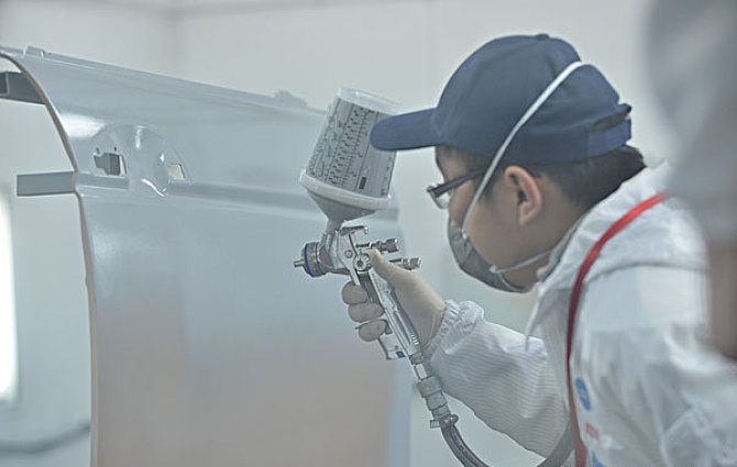 烘房温度最好为梯度升高模式,最优的方式为设置低、高温烘房,避免刚施工完水性涂料直接进入高温烘房,出现涂膜被烤焦、内部产生蜂窝状针孔等漆病;同时建议烘房中出风口平行于箱体侧表面,避免直吹侧板引起局部过热和过快的干燥。